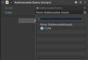 Window > Asset Management > Addressables > Group를 선택하여 Addressable 창을 열어Cube가 자동으로 등록된 것을 확인할 수 있습니다.