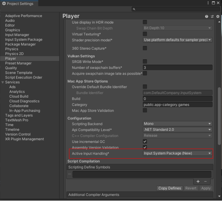 Active Input Handling 이 Input System Package (New) 로 된 것을 확인할 수 있습니다.